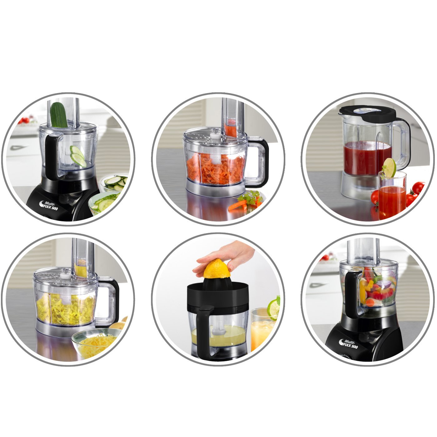 Im Unterschied zu ihrer größeren Schwester Multi-Fixx 1000 ist der Funktionsumfang der Kompaktküchenmaschine ziemlich überschaubar. Mit dem Standmixer-Aufsatz lassen sich, wie gewohnt, Shakes, Saucen und Breis mixen und pürieren sowie Lebensmittel zerkleinern. Für die zweite Schüssel hingegen ist das weitere Funktionszubehör gedacht, das aus zwei Wendescheiben besteht. Mit der ersten lässt sich Obst und Gemüse entweder raspeln oder in Scheiben schneiden, mit der zweiten wiederum reiben, etwa Kartoffeln. Gemüsestifte oder Pommes Frites wie mit der großen Schwester sind jedoch nicht machbar. Außerdem lassen sich mit dem Universalmesser diverse Zutaten hacken. Die im Datenblatt aufgeführte Ice-Crush-Funktion lässt aufhorchen, denn der Motor der Küchenmaschine leistet lediglich 500 Watt. Wenig überraschend wird daher auch in der Gebrauchsanweisung von dieser Funktion eher abgeraten – wie ein Kunde dankenswerterweise berichtet. Eine echte, weil positive Überraschung ist dagegen die Presse. Mit ihr lassen sich zwar nur Zitrusfrüchte mit Gewinn zu Saft verarbeiten, aber immerhin: Das Glas Orangensaft zum Frühstück ist gesichert.