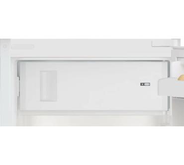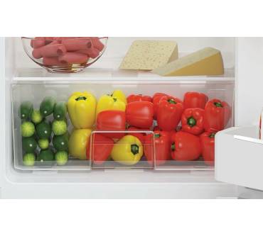 Insgesamt 97 Liter Nutzinhalt bietet der Einbau-Tischkühlschrank B1754FN von Beko. Neben zwei Ablagen und einer Gemüseschublade ist ein Vier-Sterne-Kühlfach an Bord. Das arbeitet mit sogenannter Mini-Frost-Technologie, die Eisbildung reduziert, nicht aber vollständig verhindert, wie es bei der verbreiteten No-Frost-Technik der Fall ist. Zu den Pluspunkten zählt die geringe Geräuschentwicklung von 35 Dezibel. Bauen Sie den Kühlschrank in einer offenen Küche ein, erweist sich das im Alltag als angenehm. Nachteilig wirkt sich aus, dass der Hersteller auf einen modernen Inverter-Kompressor verzichtet, der etwa einen geringeren Stromverbrauch erzeugt. Dieser ist für ein solches kompaktes Gerät hoch: Im Jahr ist mit 141 kWh zu rechnen, was Effizienzklasse E entspricht. Niedrig ist dagegen der Preis: Sie legen rund 250 Euro auf den Ladentisch.