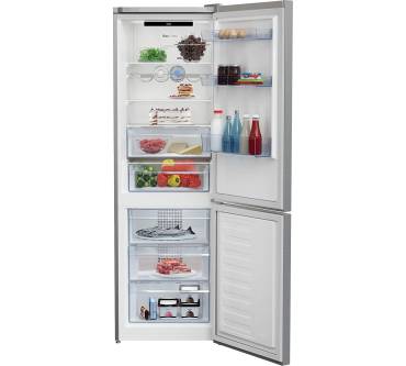 Die Kühl-Gefrierkombination RCNA366E60XBN von Beko bietet 215 Liter Kühlraum, dazu kommen 109 Liter Gefrierteilvolumen. Das passt zu Haushalten mit drei bis vier Personen. Dank getrennter Kühlkreisläufe wird eine Geruchsübertragung verhindert, außerdem können Sie beide Teile separat steuern, um die Temperatur anzupassen. Eine Schnellgefrierfunktion senkt diese kurzfristig, etwa um frische Waren fix einzufrieren. Ähnliches gibt es im Kühlfach, was etwa praktisch für Getränke ist. Auch No Frost ist an Bord, sodass Sie nicht mehr manuell abtauen müssen. Zu bemerken ist schließlich der niedrige Energiebedarf von 166 kWh im Jahr. Für das Format ist das erfreulich sparsam. Einen Minuspunkt gibt es: Das Gefriervermögen liegt bei fünf Kilogramm innerhalb 24 Stunden – weniger ist laut DIN-Norm kaum erlaubt. Angesichts des niedrigen Preises von rund 600 Euro ist das nicht überraschend.