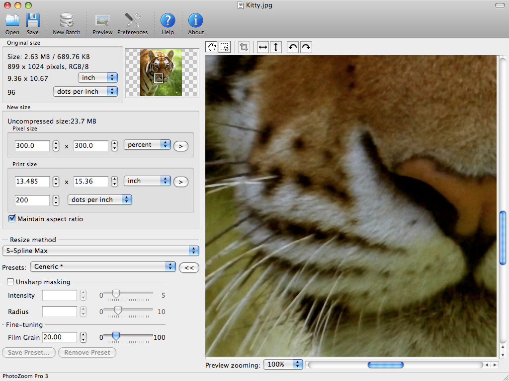 Die Version BenVista PhotoZoom Pro 3 unterstützt neuerdings Mehrprozessorsysteme, mit deren Hilfe die Bilder noch schneller bearbeitet werden können. Im Gegensatz zur Bildvergrößerung bei Photoshop soll PhotoZoom Pro 3 schärfere Bilder erzeugen. Noch die Version 2.3 der Software war jedoch dafür kritisiert worden, dass teilweise Farbflächen recht verwaschen aussahen und dass Kanten nicht immer scharf genug nachgezeichnet waren. Ob S-Spline Max das besser in den Griff bekommt? Erste Tests werden es beweisen müssen.Hier finden Sie eine kostenlose Testversion von PhotoZoom Pro 3 zum herunterladen.