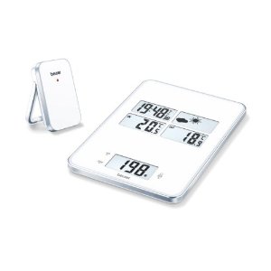 Erfreulich ist wiederum, dass das große LCD-Display aus beleuchtet ist. Dies verbessert nämlich um einiges die Ablesbarkeit der Ziffern, die wiederum eine Größe von 2,3 Zentimetern haben. Die maximale Tragkraft der Wetterstation beläuft sich auf fünf Kilogramm, gewogen wird in 1-Gramm-Schritten. Die Zuwiegfunktion ist mittlerweile eine Selbstverständlichkeit bei digitalen Küchenwaagen und daher auch in diesem Fall natürlich vorhanden. Das Design schließlich ist ausgesprochen hübsch, das solide Sicherheitsglas in Weiß verleiht der Küchenwaage eine gewisse edle, moderne Anmutung.Zu haben ist das Kombigerät für knapp über 80 EUR (Amazon), wer also tatsächlich von seiner Küchenwaage unbedingt auch noch erfahren will, wie spät es ist und wie das Wetter wird, muss demnach recht tief in die Tasche greifen. Nicht ganz so tief fällt der Griff aus, wenn die aktuellen Daten zur Luftfeuchtigkeit sowie die Uhrzeit ausreichen. Denn die KS 49 von Beurer ist momentan schon für 34 EUR (Amazon) zu haben.