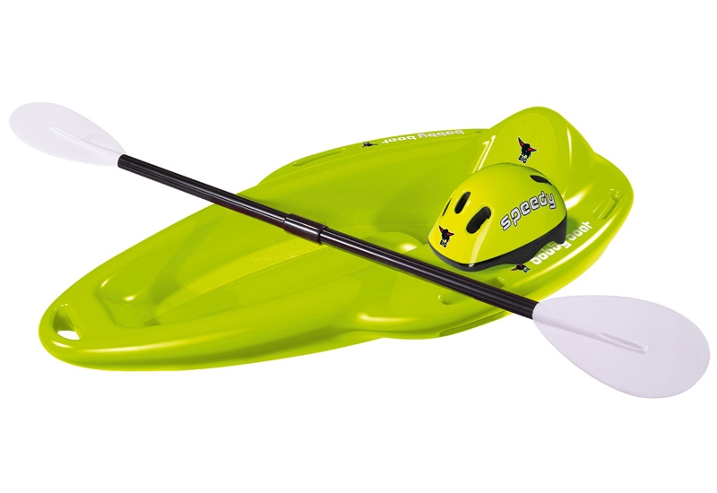 Anleihen an den Rutschern aus der Big-Familie nimmt das Booby Boat auch in puncto Ergonomie: So finden sich kindgerchte Griffmulden seitlich oder eine kindgerechte Sitzmulde und Stützmöglichekiten für die Füße. Das Bootsinnere ist mit einer fischhautähnlichen Oberfläche ausgestattet, die laut Herstellerangaben für Rutschsicherheit bürgt. Das Material besteht aus robustem Polyehtylen und soll salzwasser- und witterungsbeständig sein. Ausgliefert wird das Wasser-Bobby-Car in leuchtendem Grün mit Steckpaddel und einem passenden Helm.