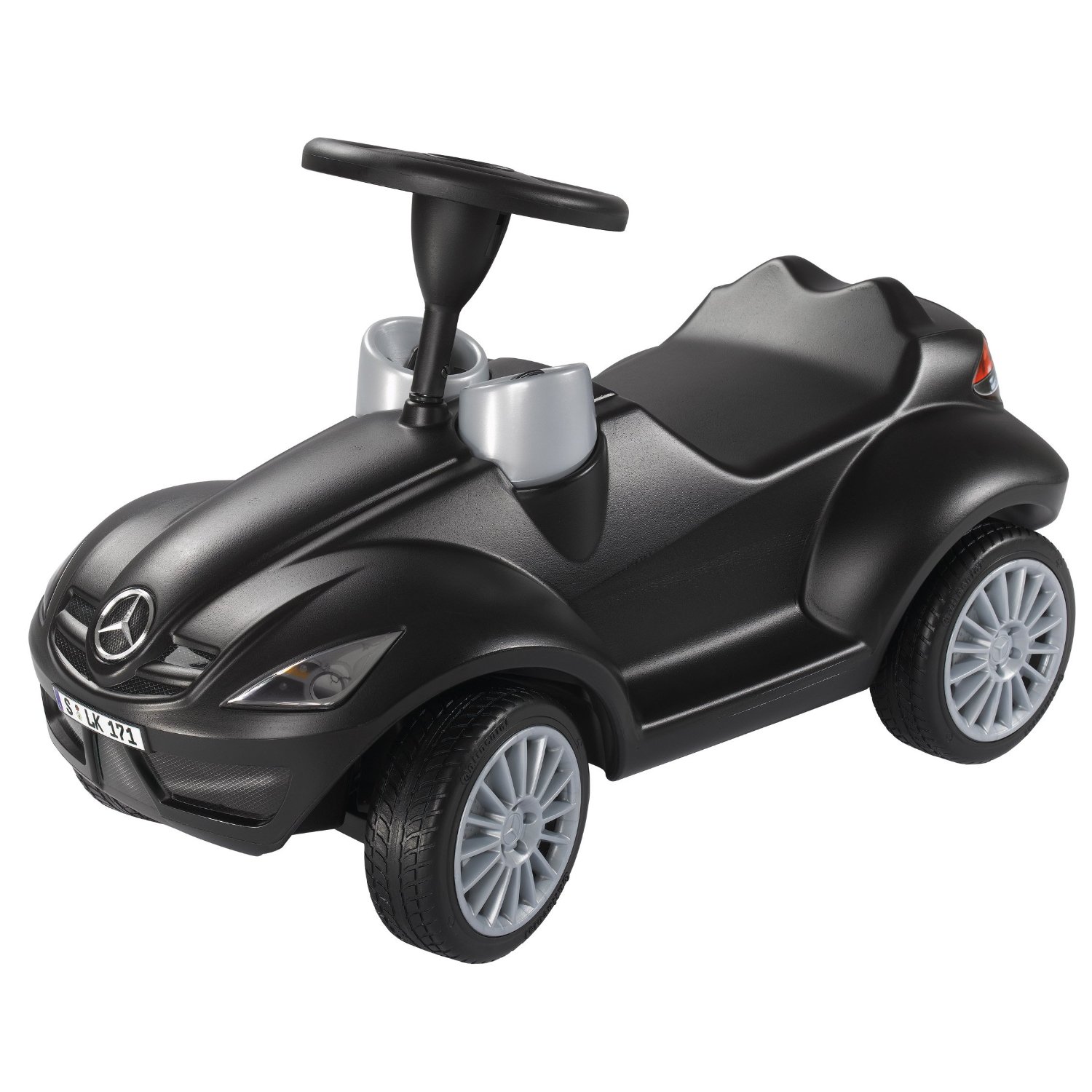 Die Karosserie des SLK-Bobby-Benz III entspricht dem Original Mercedes Benz SLK. Die typischen Benz-Designelemente finden sich auch beim Big-Rutschfahrzeug der Sonderklasse wieder – etwa in Gestalt der 3D-Aufkleber aus Polyglas, eines Sportlenkrads oder den typischen Mercedes-Benz-Felgen. Daneben gibt es eine Reihe von Extras, die einen hohen Spielwert versprechen. Eine Hupe ebenso dazu wie ein Tacho oder ein Drehzahlmesser nebst Drehregler. Eine Direktanlenkung wiederum sorgt für einen besonders kleinen Wendekreis, der Nachwuchs kann also das Gefährt tadellos um die heimischen Türpfosten herum navigieren.Flüsterreifen sorgen für geringe Lärmemission