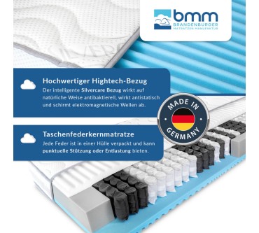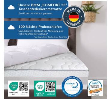 BMM stattet die Matratze Komfort 23 TFK mit einem Tonnentaschenfederkern sowie Auflagen aus Schaumstoff aus. Der Federkern sorgt aufgrund der Konstruktionsweise für ein luftiges Schlafklima, der Schaumstoff gleicht Feuchtigkeit aus. Generell ist die Kombination für Nutzer, die schnell schwitzen, eine gute Wahl. Der Härtegrad ist wählbar und lässt sich durch Wenden zusätzlich nachjustieren. So erfüllt die Unterlage die Bedürfnisse von Nutzer die gerne weich oder hart schlafen, gleichermaßen. Sie können den Bezug abnehmen und bei 60 Grad in der Maschine waschen. Den Hygienefaktor sollen eingewebte Silberfäden maximieren. Die Matratze verfügt über sieben Liegezonen, die Sie an schweren Körperpartien tiefer einsinken lassen. Das fördert eine ergonomische Haltung und entlastet. Der Effekt dürfte jedoch vergleichsweise klein sein. Der Grund ist die verhältnismäßig geringe Anzahl verbauter Federn. Auf einer Fläche von 90x200 Zentimeter sind es nur rund 350. Experten empfehlen jedoch nicht weniger als rund 500. Der Preis ist für die Ausstattung ein wenig hoch gegriffen: Sie legen circa 340 Euro auf den Tisch.