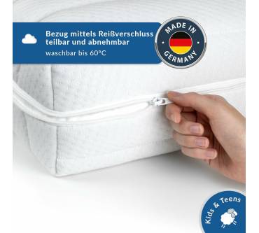 BMM empfiehlt die Upmat-Kindermatratze für Nutzer bis zu einem Gewicht von 60 Kilogramm. Sie eignet sich damit auch für große und schwere Kids. Das Material beschreibt der Hersteller als offenporigen Schaum, womit Kaltschaum gemeint sein dürfte. Dieser punktet durch eine hohe Stauchhärte und hohe Rückstellkraft: Der Schaumstoff bildet sich nach Belastung schnell zurück, sodass sich nicht so schnell Kuhlen bilden. Er bietet außerdem ein tendenziell festes Liegegefühl, das für Kinder wichtig ist. Diese sollten nicht zu tief in die Unterlage einsinken. Dazu trägt auch die für eine Kindermatratze großzügige Höhe von 14 Zentimeter bei. Das Liegegefühl beschreiben die Nutzer dennoch als weich und angenehm. Der Bezug besteht aus einen Baumwoll-Polyester-Mix und ist bei 60 Grad waschbar. Die hohe Temperatur entfernt Keime und Gerüche in der Regel zuverlässig. Das Format 90x200 Zentimeter ist aktuell für etwa 150 Euro zu haben. Diesen Preis dürfte die Kindermatratze auch wert sein.