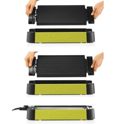 Der kompakte Tischgrill 11133 aus der Bistro-Serie von Bodum besitzt eine Wendeplatte, die auf der welligen Seite die Zubereitung mit einem typischen „Grillmuster“ ermöglicht, auf der glatten hingehen für empfindlichere Fleischsorten, Gemüse, Fisch oder auch Süßspeisen geeignet ist. Wie sich in einem großen Praxistest jedoch herausgestellt hat, eignet sich der Bodum weniger zum scharfen Anbraten beziehungsweise Grillen bei Tisch, sondern mehr für die schonende Zubereitung durch Garen.