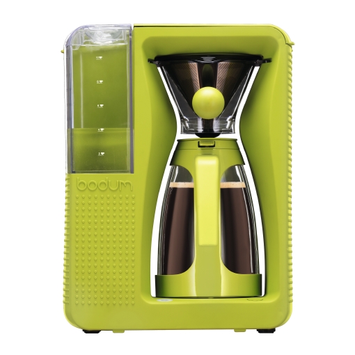 Der Kaffee landet anschließend in einer Glaskanne, die doppelwandig ist und daher den Kaffee länger heiß hält. Die zweite Wand besteht dabei aus Kunststoff und nicht aus Glas, um die Kanne vor Stößen und bei Stürzen besser abzusichern. Beim Filter wiederum handelt es sich um ein Permanent-Modell, für das keine Papierfilter mehr benötigt werden, und der aus titanbeschichtetem Edelstahl besteht. Das Gehäuse der Maschine wiederum wird aus Kunststoff gefertigt, der mit einer gummiartigen Schicht überzogen ist und damit die Bodum-typische haptische Anmutung bietet. Der Griff des Permanentfilters sowie der Kaffeekanne hingegen werden mit Silikon ummantelt, damit sie sich ebenfalls angenehmer anfühlen.