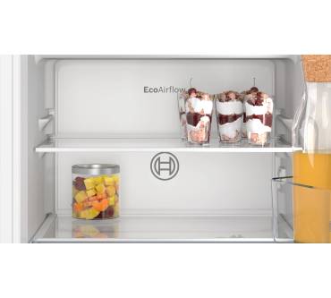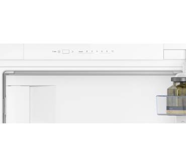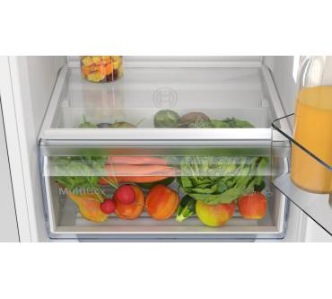 Der Einbaukühlschrank von Bosch bietet ein nutzbares Volumen von 119 Liter und ist damit eine Option für kleine Haushalte oder Gewerbebetriebe. Die kalte Luft im Kühlteil wird durch ein Ventilationssystem gleichmäßig verteilt. Ihre Lebensmittel finden auf zwei Einlegeböden aus Glas, in zwei Türfächern und einem kleinen Flaschenregal ihren Platz. Kleine Mengen Tiefkühlkost bringen Sie in dem 15 Liter fassenden Gefrierfach unter. Stromausfälle überbrückt der kleine Bosch über einen Zeitraum von 10 Stunden. Die Energieeffizienz kann nicht umfänglich überzeugen, der Kühlschrank schafft es lediglich Ihnen die Energieeffizienzklasse E. Vergessen Sie das Schließen der Tür, macht Sie ein Alarm darauf aufmerksam. Mit einem Lärmwert von nur 35 Dezibel gehört der Bosch zu den leisen Modellen. Das Einbaugerät ist zur Schlepptür-Montage vorgesehen.