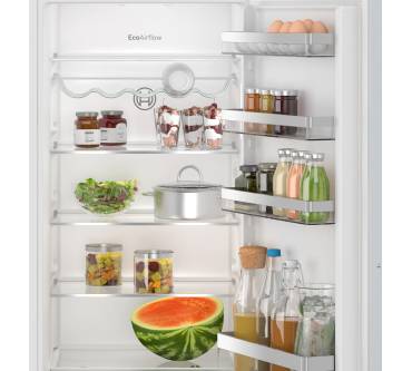 Der Kühlschrank bietet mit 204 L ausreichend Platz für die Lebensmittel von kleinen Familien bzw. 3-Personen-Haushalten. Die Temperatur kann gradgenau festgelegt werden. Dank Eco-Airflow-Umluftkühlung ist die Temperatur im gesamten Kühlraum gleich hoch. Schnellkühlen kann vor dem Einkauf aktiviert werden: Dann sinkt die Temperatur im Kühlschrank temporär, sodass neue Lebensmittel zügig die Zieltemperatur erreichen. Schnellkühlen schaltet sich automatisch wieder ab. Für Obst und Gemüse ist eine Schublade vorhanden. Für Flaschen gibt es ein entsprechendes Regal. Vier Glasböden können in der Höhe verstellt werden, auch die Abstellflächen in der Kühlschranktür sind verstellbar.