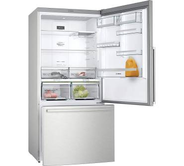 Die Kühl-/Gefrierkombination von Bosch gehört mit einem Volumen von über 600 Liter zu den besonders geräumigen Modellen, die ausreichend Platz für die Vorräte größerer Familien und WGs bieten. Zahlreiche Einschubmöglichkeiten und eine geräumige Gefrier-Box bieten Ihnen Möglichkeiten zur individuellen Platzeinteilung. Ein Umluftsystem sorgt für die gleichmäßige Verteilung der Kälte. Ihr Obst und Gemüse bringen sie in zwei transparenten Schubladen mit Feuchtigkeitsregulierung unter. Im Gefrierteil verhindert ein No-Frost-System die Bildung energiefressender Eisablagerungen. Die gewünschten Einstellungen nehmen Sie über ein Touch-Bedienfeld mit Display vor, das Sie von außen, ohne den Kühlschrank zu öffnen, erreichen. Die Lagerzeit bei Störungen ist mit 22 Stunden ausreichend bemessen.