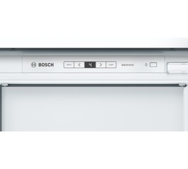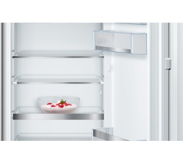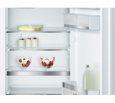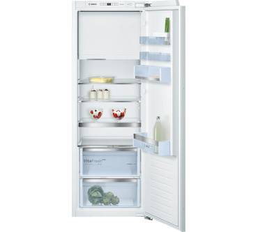 Diese Kühl-Gefrierkombination von Bosch bietet Ihnen neben herausziehbaren Glasablagen auch eine teilbare Option, sodass Sie große Flaschen oder Packungen bequem unterbringen. Das Gefrierfach ist laut Hersteller tief genug, um Pizzapackungen aufzunehmen. Das Gefriervermögen ist mit bis zu 4,6 kg pro Tag gut, insgesamt haben Sie 34 Liter in diesem Bereich zur Verfügung. Allerdings können Sie die Temperaturen nicht getrennt einstellen, sondern hängt sie von den Graden im Kühlteil ab. Aktivieren Sie die nährstoffschonende Schnellkühlfunktion, wird laut Bedienungsanleitung auch frisches Gefriergut schneller eingefroren. Für Obst und Gemüse wird die Feuchtigkeit in der „VitaFresh“- Schublade reguliert und soll die Haltbarkeit dadurch verdoppeln. Preislich ist das Modell relativ hoch angesetzt, auch die Energiebilanz lässt Luft nach oben.