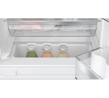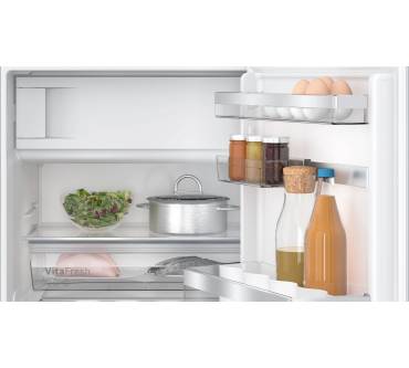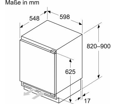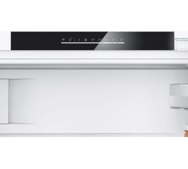 Der Unterbau-Kühlschrank von Bosch gehört mit einem Gesamtvolumen von 110 Liter zu den kompakten Vertretern seiner Produktkategorie. Im Kühlteil nutzen Sie eine Ablagefläche aus Sicherheitsglas, zwei Türfächer und ein kleines Flaschenregal zur Aufbewahrung Ihrer verderblichen Lebensmittel. Das Gefrierteil bietet mit einem Volumen von 17 Liter ausreichend Platz für kleine Mengen Tiefkühlkost. Ein LED-Licht sorgt für Überblick über Ihre Lebensmittel. Vergessen Sie das Schließen der Tür, werden Sie akustisch gewarnt. Mit einem Lärmwert von 35 Dezibel arbeitet der Bosch erfreulich leise. In Sachen Energieeffizienz schafft es der Kühlschrank ins Mittelfeld, er ist in die Energieeffizienzklasse D eingruppiert. Das Touch-Panel zur Bedienung ist bei geschlossener Tür verdeckt. Den Betriebsstatus können Sie auch über Ihr Smartphone abfragen, der Bosch ist WLAN-fähig.