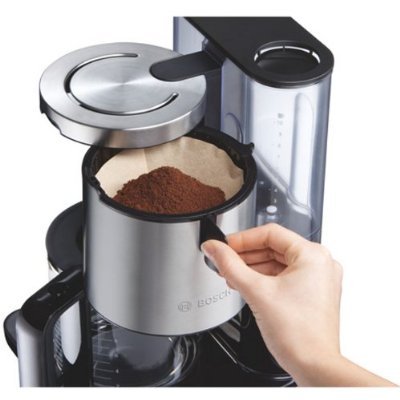 Innerhalb des Sortiments von Bosch ist die Kaffeemaschine die nahezu baugleiche Schwester der Styline TKA8653. Der markanteste Unterschied zwischen den beiden Geräten liegt in der Kaffeekanne. Denn während bei der TKA8653 der Kaffee in eine Thermokanne fließt (und zwar, nebenbei erwähnt, auch etwas weniger), kommt hier eine gewöhnliche Glaskanne zum Einsatz. Dafür wird der Kaffee wie gewohnt über eine Warmhalteplatte auf Temperatur gehalten, wobei die Bosch diese Aufgabe besser zu erfüllen schient als etliche Konkurrenzmodelle. Auch nach längerer Zeit „verkocht“ der Kaffee nicht, sondern bleibt lediglich heiß – also genau so, wie er aus der Maschine gekommen ist. Nach zwei Stunden schaltet sich die Warmhalteplatte aber aus Sicherheitsgründen von alleine ab. Zu den weiteren Annehmlichkeiten der Maschine gehört ferner noch ein abnehmbarer Wassertank. Zu den weniger angenehmen Eigenschaften des Geräts gehört allerdings, dass der Tank keinen Griff besitzt, der Transport zum Wasserhahn und vor allem zurück zur Kaffeemaschine erfordert also buchstäblich ein bisschen Fingerspitzengefühl. Darüber hinaus besitzt die Bosch einen Timer, der sich außerdem merken kann, wann der Kaffee fertig sein soll. Der Tank wiederum fasst etwa 1 Liter Wasser, genug für – je nach Füllmenge – 10 bis 15 Tassen Kaffee.