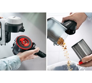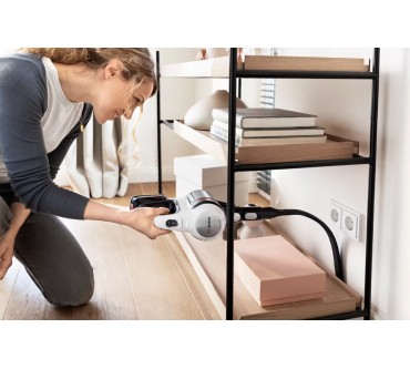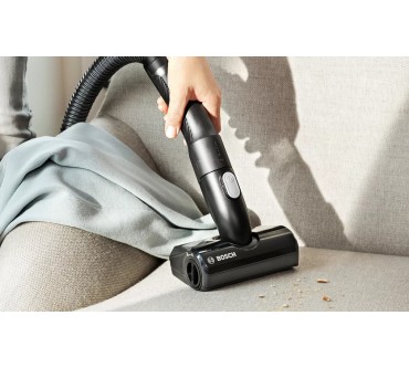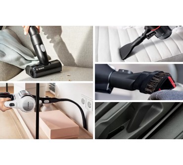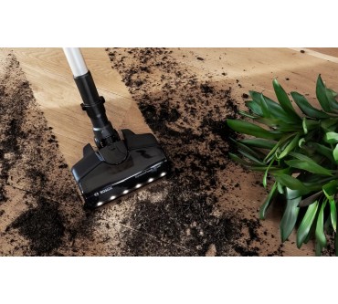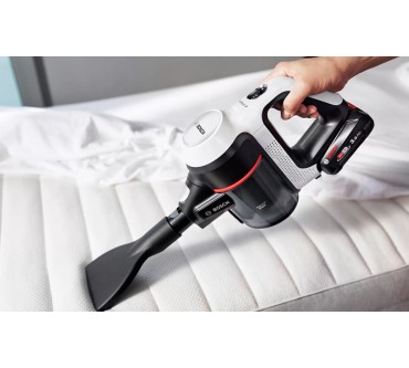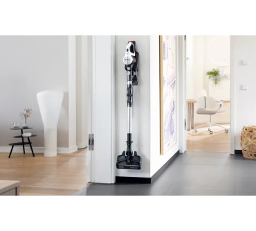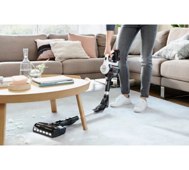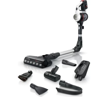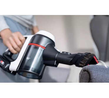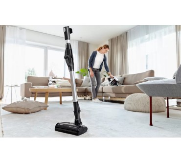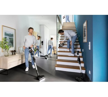 Ein umfangreiches Zubehör und zahlreiche schlaue Features fallen beim Bosch-Akkusauger Unlimited 7 BKS711MTB auf. Unter anderem lässt sich das Saugrohr abknicken, sodass Sie einfacher unter Möbel und in schwer erreichbare Ecken gelangen. Eine LED-Beleuchtung an der Saugdüse macht Staub und Co. einfacher sichtbar. Darüber hinaus liegen eine Fugendüse, ein Möbelpinsel und eine motorisierte Minibürste bei. Diese verstärkt die Saugkraft und optimiert vor allem die Reinigung von Teppichen und Polstern. Die Akkulaufzeit ist im passablen Bereich: Im Eco-Modus arbeiten Sie bis zu 40 Minuten mit einer Ladung, auf der stärksten von drei Stufen sind noch rund 10 Minuten drin. Ist die Batterie leer, kann es allerdings gleich weitergehen, denn Sie können den Akku austauschen: Alle Batterien des „Power For All Alliance“-Systems passen, es liegt allerdings kein zweiter bei. Ein Pluspunkt ist schließlich das geringe Gewicht: Insgesamt rund drei Kilogramm lassen sich in der Regel komfortabel manövrieren. Sie zahlen zurzeit rund 450 Euro für den vielfältigen Akkusauger.