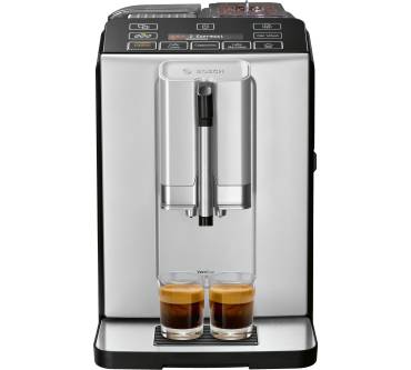 Der Kaffeevollautomat VeroCup 300 von Bosch zeigt sich intuitiv in der Bedienung: Mit einem Knopfdruck sollen Ihnen Kaffee, Cappuccino und Espresso optimal gelingen. Dabei können Sie Stärke und Mahlgrad der Bohnen individuell einstellen. Der Wassertank hat ein Volumen von 1,4 Liter, der Bohnenbehälter fasst 250 Gramm – damit ist die Maschine vor allem für den Gebrauch in kleinen bis mittelgroßen Haushalten oder auch für kleine Bürogemeinschaften geeignet. Der Wasserdruck von 15 Bar verspricht aromatischen Kaffee.