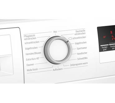 Mit diesem Modell von Bosch erhalten Sie einen soliden Wärmepumpentrockner für bis zu 7 kg Wäsche. Diese wird durch die schonende Trommelstruktur und weichen Mitnehmer schonend behandelt und dank Sensortechnik punktgenau getrocknet. Neben den gängigen Basisprogrammen und der Auswahl des Trocknungsgrades steht Ihnen eine spezielle Einstellung für Sportwäsche zur Verfügung, welche die Atmungsfähigkeit des Materials schützt. Alle Einstellungen lesen Sie gut sichtbar am LED-Display ab. Laut Bewertung von Stiftung Warentest punktet der Bosch mit einem gleichmäßigen Trocknungsergebnis, die Programmdauer wird aber nur mit „Ausreichend“ bewertet. Auch der Energieverbrauch ist gegenüber Kollegen etwas erhöht. Bei den bereits zahlreichen Rezensenten schneidet das Produkt aber zu über 80 Prozent sehr gut ab und ist im Hinblick auf den fairen Preis keine verkehrte Wahl.