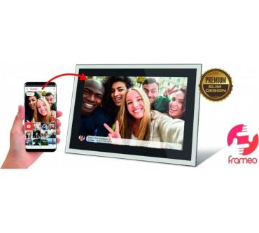Vom Smartphone direkt auf das Display - diese Funktion bringt der DigiFrame 10X WiFi von Braun mit. Die Verbindung über WLAN und die Steuerung über die Frameo-App sind allerdings kein Muss, denn alternativ können Bilder auf dem 16 Gigabyte großen Speicher oder auf einer Speicherkarte hinterlegt werden. Einstellungen werden direkt über den Touchscreen vorgenommen. Der Bilderrahmen stellt nicht nur Fotos dar, sondern auch Videos. Deren Länge ist allerdings auf 15 Sekunden begrenzt. Ein integrierter Lautsprecher dient der Tonwiedergabe. Die Leistung von zweimal einem Watt verspricht jedoch keinen satten Sound. Der Bilderrahmen kann aufgestellt oder an die Wand gehängt werden. Zu hoch sollte er allerdings nicht hängen, denn eine Fernbedienung gehört nicht zum Lieferumfang.