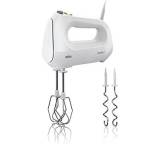 Der klassische Handmixer MultiMix 1 HM 1010 WH von Braun arbeitet mit 400 Watt Leistung. Der starke Motor lässt auf eine effektive Verarbeitung praktisch aller Zutaten schließen. Selbst schwere Hefeteige sollten Sie mühelos und ohne Überhitzungsgefahr des Gehäuses durchkneten können. Dazu trägt auch das geringe Gewicht von knapp unter 900 Gramm bei. Im Lieferumfang liegen neben den dafür notwendigen Teighaken auch Rührbesen bei – und damit die klassische Ausstattung. Im Betrieb werden rund 66 Dezibel erreicht, was für einen Handmixer ein guter Wert ist. Die Geräuschentwicklung dürfte selbst im längeren Betrieb nicht stören. Sie wählen vier Geschwindigkeitsstufen aus und passen die Leistung damit exakt auf die Speisenarten an. Auch ein Turbomodus ist an Bord, lässt sich allerdings nicht direkt, sondern nur als fünfte Stufe auswählen. Mit einem Blick auf den Preis ist dieser Umstand nicht weiter schlimm: Für die ansonsten sehr gute Leistung zahlen Sie knapp 37 Euro.