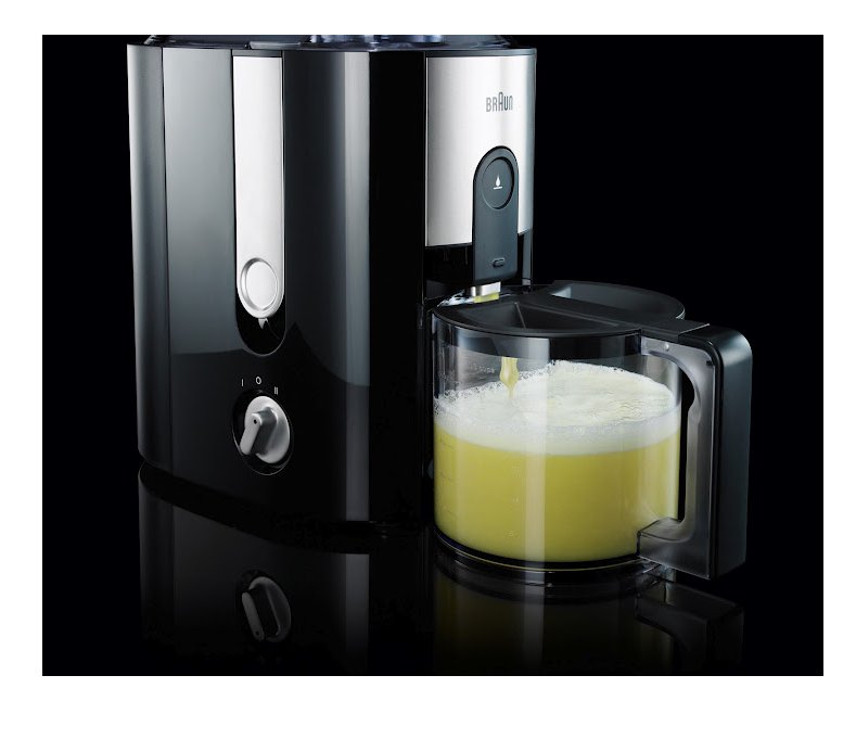 Ohne Frage ist der neue Entsafter, der seit Anfang Januar auch lieferbar ist, sehr schmuck anzuschauen. Das Plastikgehäuse ist fast komplett in Schwarz gehalten, die Form wiederum ohne jeden Schnickschnack auf die eigentliche Funktion beschränkt. Hervorzuheben ist dabei unter anderem der große Einfüllstützen. Er misst 75 Millimeter und kann daher mitunter ganze Äpfel aufnehmen, größere Früchte oder Gemüsesorten müssen nur grob vorbereitet werden. Der Motor wartet mit einer hohen Leistungsaufnahme von maximal 800 Watt auf, dem Benutzer stehen außerdem zwei Geschwindigkeitsstufen zur Verfügung, damit sich das Gerät den Früchten anpassen kann: Weiche Äpfel benötigen schließlich weniger Kraft als Mohrrüben zum Beispiel. Nach dem Entsaften trennt ein speziell von Braun entwickeltes Mikrosieb den Saft vom Schaum, das ganze Prozedere soll dabei sehr schnell über die Bühne gehen. In einem Rutsch lässt sich etwa 1,25 Liter Saft herstellen, der Trester wiederum fasst 2 Liter und kann abgenommen und in der Spülmaschine gereinigt werden. Der Braun verspricht außerdem, dass sich der Saft ohne zu Kleckern in das Glas ergießt – ein Spritzschutz soll dafür sorgen, dass die Küche nicht in Mitleidenschaft gezogen wird.