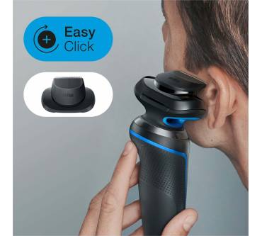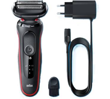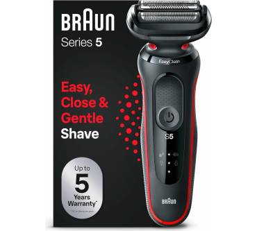 Der Braun Series 5 bietet eine gründliche Rasur bei einfacher Handhabung. Die drei flexiblen Scherköpfe passen sich problemlos den Gesichtskonturen an und entfernen die Haare zuverlässig. Die sogenannte AutoSense-Technologie erkennt die Bartdichte und passt die Leistung automatisch an. Zur Reinigung genügt fließendes Wasser, wobei Sie den Scherkopf nicht abnehmen müssen. Der Rasierer ist für Nass- und Trockenanwendungen geeignet und vollkommen wasserdicht. Sie können ihn also auch auf eingeschäumter Haut oder unter der Dusche verwenden.