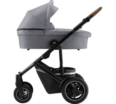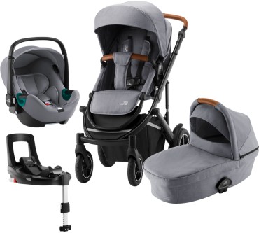 Wer sich bei Britax Römer nach neuen Kinderwagen umschaut, wähnt sich manchmal auf einem Gadget-Festival. Mit dem Smile III Comfort Plus iSense 4-in-1 Set legt der Kinderwagen- und Sitzhersteller einmal mehr den ganz großen Auftritt hin. Gegen einen Tausender erhalten Sie hier ein komfortables Komplettset mit Fahrgestell, Sitzeinhang, Liegewanne und beleuchteter i-Size-Babyschale. Letztere ist nach neuester Prüftechnik (i-Size) zugelassen und besonders praktisch in Verbindung mit der mitgelieferten Isofix-Basisstation: Weil sie zur Türseite hin drehbar ist, sparen Sie sich das Gefrickel beim Reinsetzen und Angurten. Die Basis bleibt im Auto, die Schale ist im Handumdrehen ein- und ausgeklickt.