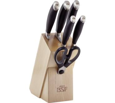 Einem guten Handling dienen die ergonomischen Griffe aus rutschfestem Kunststoff, deren Kropf am Übergang zwischen Heft und Klingenblatt einen ausgeprägten Handschutz bietet. Zum BSF Messerblock natur 7-tlg. Orlando finden sich bis dato noch nicht allzu viele Kundenmeinungen bei Amazon, aber von den knapp eineinhalb Dutzend sind die meisten absolut positiv. Wobei man noch berücksichtigen sollte, dass es dort derzeit für gerade einmal EUR 70 gehandelt wird, das macht im Durchschnitt einen Zehner für jedes Einzelprodukt.