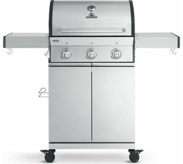 Burnhard gibt auch diesem schlicht gehaltenen und kompakten Grillwagen ordentlich Zubehör und kleine Extras mit. Die 3 Hauptbrenner mit je 3,5 kW Leistung sind per Piezozündung auf Knopfdruck gestartet, die Temperatur regeln Sie stufenlos und getrennt. Die W-förmigen Flavor-Bars verteilen die Hitze gleichmäßig und sorgen für mehr Geschmack. Wollen Sie ein rauchiges Aroma erreichen, nutzen Sie die mitgelieferte Smokerbox. Ebenfalls dabei ist eine UV-beständige Abdeckhaube - bei Modellen dieser Preisklasse eher unüblich. Neben den klappbaren Seitentischen haben Sie weitere Ablagemöglichkeiten wie Haken für Ihr Grillbesteck und sogar einen Küchenrollenhalter. Ein Flaschenöffner für den durstigen Grillmeister ist auch integriert. Mit 43,5 kg ist der Fred Basic gut manövrierbar, einige Nutzer finden die Transporträder aber etwas zu klein.