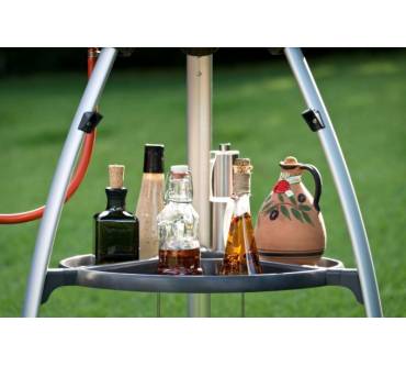 Der mitgelieferte Grillrost ist wertig mit Keramik überzogen. Optional sind weitere Zubehöre wie beispielsweise ein Pizzastein erhältlich. Im Untergestell des Grills finden Sie eine geräumige Ablage, die Sie auch als Topfständer nutzen können. Der Grill kann wahlweise mit einer Gasflasche oder mit Kartuschen betrieben werden.