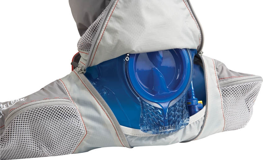 Der Trinkschlauch selbst kann je nach Wunsch entweder unterm Arm oder über der Schulter zum Mund geführt werden. Wie in den ersten Testberichten nachzulesen ist, könnte er speziell für groß gewachsene Sportler mitunter etwas zu kurz ausfallen und müsste entsprechend zusätzlich verlängert werden. Von Vorteil ist ferner noch, dass die Trinkblase bequem von außen nachgefüllt werden kann, die Einfüllöffnungen wiederum fällt größer aus als bei seinen Vorgängern und erleichtert die Reinigung. Überhaupt hat Camelbak die Trinkblase einer Generalüberarbeitung unterzogen, so fällt sie auch schlanker aus und lässt sich leichter öffnen. Zusammen mit den ebenfalls leichten Materialien entpuppt sich der Camelpak daher mit rund 360 Gramm als Leichtgewicht.