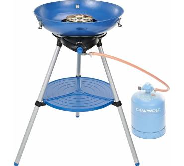 Der Party Grill 600 R von Campgingaz kommt mit 4 Kochflächen daher und hat genug Power für saftige Steaks und knuspriges Gemüse. Neben einem klassischen Rost haben Sie eine wendbare Platte mit geriffelter und glatter Seite zur Verfügung. Sie können also auch Shrimps oder Fisch nach Planchaart zubereiten oder Ihre Frühstückseier braten. Als weitere Option kochen Sie Suppen oder Kaffee im Topf auf dem mitgelieferten Kreuz. Damit haben Sie praktisch eine Komplettküche für das Camping oder die Gartenparty. Gut gelöst: Das abtropfende Fett wird in einer mit Wasser gefüllten Schale gesammelt und kann sich so nicht festsetzen. Nach dem Grillen gießen Sie die Flüssigkeit einfach aus. Alle Aufsätze sind spülmaschinengeeignet, sodass die Reinigung schnell erledigt ist.