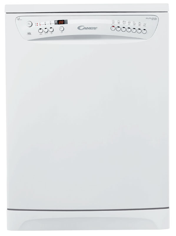 Ausgestattet ist der Candy Futura CDF 705 mit insgesamt 7 Programmen. Unter anderem gibt es ein Schnellprogramm, das nur 32 Minuten zum Spülen benötigt oder auch ein Intensivprogramm, bei dem sehr schmutziges Geschirr bei hohen Temperaturen von 75 Grad gründlich gereinigt werden sollen. Die Bedienung des Gerätes erfolgt über diverse Tasten, auf dem Bedienfeld befindet sich außerdem ein Display, das unter anderem Auskunft über die Restlaufzeit des Programms oder die gewählte Startzeit gibt.