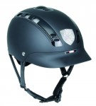 Es gibt nicht wenige Reiter(innen), die zwar der neuen Generation an Reithelmen aufgeschlossen begegnen, dem Stil und der Ästhetik des klassischen Reithelms mit Samtbezug trotzdem mindestens eine Träne nachweinen. Einige Hersteller tragen dem Rechnung und versuchen deshalb, den neuen Helmen ebenfalls ein gewisses Extra mit auf den Weg zu geben – wie zum Beispiel Casco. Der Hartplastikhelm will mit ein paar gezielt eingesetzten optischen Reizen Aufmerksamkeit erregen. Dazu gehören etwa ein Emblem aus Aluminium, das die Stirnseite ziert, sowie eine Glanzlacküberzug an den Belüftungselementen sowie eine „aufwändig umnähte Beriemung“. Ob dies ausreicht, dem Reithelm Käufer zuzuführen, sei dahingestellt. Dass er sich damit aber von seinen Mitbewerbern zumindest optisch absetzen kann, steht außer Frage.