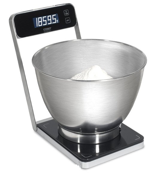 Ohne Frage pfiffig gelöst wurde hingegen das Handling der Küchenwaage. Das Anzeigefeld kann ausgeklappt werden, so dass über der aus Edelstahl bestehenden Schüssel zu stehen kommt und damit sehr gut ablesbar ist – zumal auch die digitale Anzeige recht großzügig ausfällt. Bei den meisten Mitkonkurrentinnen ist das Anzeigefeld hingegen direkt auf der Stirnseite in die Wiegefläche integriert – mit all den daraus resultierenden Nachteilen in puncto Ablesbarkeit. Unabhängig von ihrer Messgenauigkeit bietet sich daher die Caso aufgrund ihrer Bauweise für Kunden an, denen das Handling einer Digitalwaage bislang zu unpraktisch erschienen ist, oder deren Sehkraft schwächer ist. Zusammengeklappt wiederum lässt sich die Caso außerdem leicht verstauen, außerdem macht die Kombination aus Glas und Edelstahl in puncto Anmutung und Optik einiges her. Die maximale Tragfähigkeit schließlich liegt bei 5 Kilogramm, die Bedienung erfolgt über berührungsempfindliche Tasten, und auf die Kunst des Zuwiegens (Tara-Funktion) versteht sich die Caso ebenfalls.