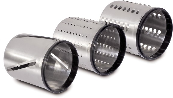 Im Unterschied zur Multireibe von Caso wird die Chef-Reibe, wie sie vom Hersteller auch genannt wird, lediglich mit Reiben für die Zubereitung von schmalen/breiten Julienne sowie Scheiben ausgeliefert. Für Nüsse, Kartoffeln oder Käse eignet sich das Gerät also weniger gut. Die technische Ausstattung wiederum garantiert, dass Obst und vor allem Gemüse zügig und ohne zu Stocken verarbeitet werden – der Motor weist nämlich eine Leistungsaufnahme von 240 Watt auf. Das Gehäuse wiederum besticht durch eine Edelstahloptik, die Reibetrommeln selbst bestehen aus Edelstahl. Außerdem ermöglicht der großzügig dimensionierte Einfüllstutzen eine komfortable Bedienung. Gemüse zum Beispiel muss nicht erst langwierig vorbereitet werden, bevor es weiterverarbeitet werden kann. Der Einfüllstutzen sowie die reiben lassen sich abnehmen und in der Spülmaschine reinigen – ein weiterer kleiner Beitrag der Caso zur „schnellen Küche“. Mit Maßen von 140 x 300 x 240 Millimeter lässt sie sich nach getaner Arbeit leicht wieder im Küchenschrank verstauen.
