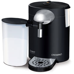 Nein, der Caso Cremino ist keine kompakte Espressomaschine. Es handelt sichbei diesem Gerät vielmehr um einen unkompakten Milchaufschäumer. Der funktioniert ähnlich, wie die Schäumer bei großen Kaffeeautomaten: Die Milch wird in einen Milchbehälter gefüllt, von dort saugt das Gerät die Milch an, erhitzt sie durch den eingebauten Thermoblock und schäumt sie durch Wasserdampf auf. Um Wasserdampf produzieren zu können, verfügt das Gerät über einen Wassertank. Nun wird unter den Auslauf ein Gefäß gestellt, ein Knopf gedrückt und – voilà – schon fließt die weiße Creme in Tasse oder Glas. Sehr praktisch ist der Regler, durch die die Konsistenz des Schaums reguliert werden kann. Für Kakao kann die Milch auch ganz einfach nur erhitzt werden. Ist die Arbeit erledigt, kann die Milch samt Behälter zur Aufbewahrung in den Kühlschrank gestellt werden.