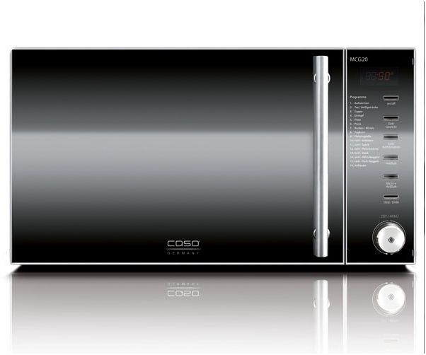 Auch äußerlich hat die Caso MCG25 einiges zu bieten. Das Gehäuse besteht aus Edelstahl, die Glastür ist verspiegelt und lässt den Blick auf das Innere nur frei, wenn das Gerät in Betrieb ist. Auch sehr praktisch ist die Bedienung: Auf dem Bedienfeld befindet sich die komplette Liste der Automatikprogramme. So muss man die Bedienungsanleitung nicht bemühen.