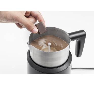 Der Milchaufschäumer von Caso bereitet für Sie Milchschaum ebenso zu wie heiße Schokolade. Dank des im Lieferumfang enthaltenen Körbchens können Sie für die Zubereitung Ihrer Schokogetränke auch ganze Schokoladenstückchen verwenden. Ein Schaumbesen sowie eine entnehmbare Edelstahlkanne mit Glasdeckel sind ebenfalls im Lieferumfang enthalten. Das Gerät funktioniert nach dem Induktionsverfahren. Laut Hersteller soll dadurch das Anbrennen der Milch wirkungsvoll verhindert werden. Nicht eben großzügig zeigt sich Caso bei der elektrischen Zuleitung. Diese ist mit 70 Zentimeter deutlich zu kurz geraten. Nach dem Milchaufschäumen können Sie die beweglichen Komponenten inklusive Kanne zur Reinigung bequem in die Spülmaschine geben.
