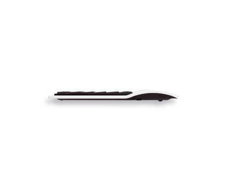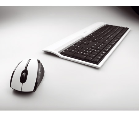 Soft-Touch-Oberfläche zum Handschmeicheln sowie eine integrierte Verstaumöglichkeit für den USB-Dongle. Die Tastatur wiederum soll flüsterleise sein, hat 10 Hotkeys für die komfortable, schnelle Bedienung von Multimedia-Anwendungen direkt von der Tastatur aus und ist außerdem – und hier greift wieder das Design-Diktat – sehr flach, also „slim“, wie der gängige Ausdruck dafür heißt. Das Standard-Tastatur-Layout umfasst natürlich auch einen Nummern-Block.