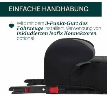 Leicht & unkompliziert. Leicht zu installierende Sitzerhöhung für Kinder von 7 bis 12 Jahren (126-150 cm). Dank seiner optionalen Isofix-Konnektoren für verschiedene Fahrzeuge geeignet. Gepolsterte Armlehnen und einfache Gurtführung. Wegen fehlenden Seitenschutzes nur als Notsitz geeignet.