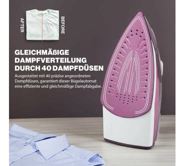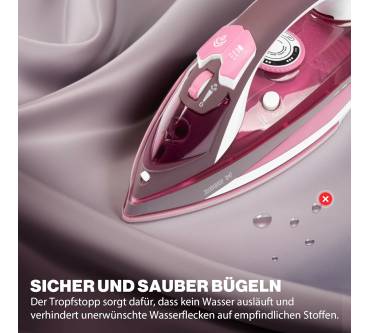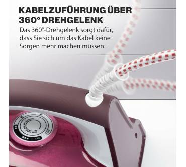 Das komfortable und sichere Dampfbügeleisen eignet sich ideal für den Einstieg. Es bietet 2.600 Watt Leistung und eine stufenlose Temperaturregelung für eine individuelle Anpassung an jedes Gewebe. Zu den sieben Funktionen zählen eine Sprüheinrichtung, ein Dampfstoß und eine Vertikaldampffunktion für beispielsweise hängende Textilien, sowie eine praktische Trockenfunktion, bei welcher der Dampf abgeschaltet werden kann. Die kraftfeste Keramikbügelsohle besitzt Nutzern zufolge ein hervorragendes Gleitverhalten auf allen Stoffen. 40 Dampfdüsen ermöglichen eine gleichmäßige Dampfverteilung und mit Hilfe der vierstufigen Dampfregelung können Sie auf sämtliche Arten von Falten eingehen. Soft-Touch-Bedienelemente und ein gummierter Griff sorgen für eine komfortable Handhabung und rutschsicheren Halt beim Bügeln. Das 360-Grad-Drehgelenk des Kabels gewährt maximale Bewegungsfreiheit. Den Füllstand haben Sie dank transparenten 380 Milliliter Wassertank stets Blick. Für weiteren Komfort sorgen ein Tropfstopp gegen Wasserflecken, ein Anti-Kalk-System und eine zuschaltbare Selbstreinigungsfunktion für langanhaltende Bügelleistung.