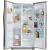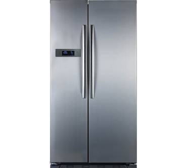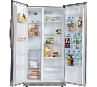 Das mit 537 l vergleichsweise kompakte Side-by-Side-Gerät ist eher schlicht ausgestattet. Simple Schubladen und mäßig flexible Einlegeböden prägen den Innenraum. Die Beleuchtung übernehmen an der Decke befindliche Lichtbalken, die laut Fachpresse nach Öffnen der Tür verzögert anspringen. Der Gefrierer ist mit 192 l überraschend großzügig.