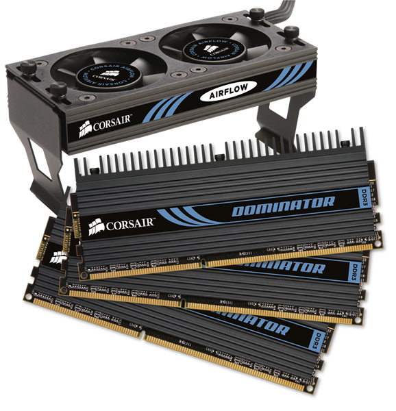 Corsair baut seine Dominator-Erfolgsserie mit dem 12 GByte-Kit, bestehend aus 3 x 4 GByte, weiter aus und bietet ein neues Triple-Channel-Set auf Basis von PC3-12800 an. Für rund 200 Euro (amazon) erhält man dann ein beeindruckendes Paket, bestehend aus den drei RAM-Modulen mit großen, schwarzen Heat-Spreadern. Hinzu kommt der DHX-Pro Connector mit der Airflow II Kühlung. Gleich zwei Lüfter sorgen für kühle Luft im RAM-Bereich und ermöglichen so eine maximale Übertaktung der Speicherbausteine.