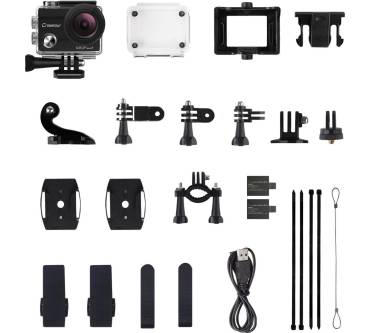 Die kompakte Action Cam nimmt Fotos und Videos auf einer zusätzlich zu erwerbenden MicroSD-Karte auf, die eine Kapazität von bis zu 32 Gigabyte haben darf. Da die Kamera über ein WLAN-Modul verfügt, können die Aufnahmen schnurlos auf ein Smartphone oder einen Tablet-PC übertragen werden. Voraussetzung hierfür ist, dass auf diesen Geräten die Betriebssysteme Android oder iOS laufen und die entsprechenden Apps installiert werden. Mit der Kamera werden eine Vielzahl von Halterungen sowie ein wasserdichtes Gehäuse für Unterwasseraufnahmen mitgeliefert. Bis zu 30 Meter in die Tiefe kann es mit diesem Gehäuse gehen. Im Lieferumfang befinden sich außerdem zwei Akkus, die jeweils Energie für rund 90 Minuten Aufnahme liefern sollen.