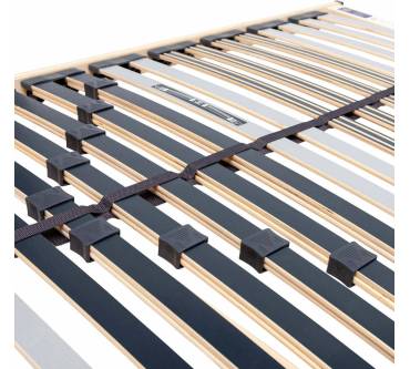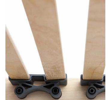Seine stabilen Federleisten aus Birkenholz sind für noch mehr Stabilität durch einen Mittelgurt miteinander verbunden. Am Rahmen sind sie mit Kunststoffkappen befestigt. Diese verhindern das Quietschen durch Reibung von Holz auf Holz und erlauben bei Bedarf den unkomplizierten Austausch einzelner Leisten. Durch ihre Anordnung entstehen fünf Liegezonen. Fünf Leisten in der mittleren Zone können durch Schieberegler passend zum gewünschten Härtegrad verstellt werden.