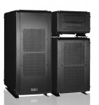 Magic Cube heißt die neue Baureihe und setzt sich aus drei separaten Modulen zusammen, die nebeneinander und übereinander positioniert werden können. Neben dem optischen Eindruck – ein echter Hingucker in Schwarz – hat die Trennung der Komponenten auch große thermische Vorteile. So werden im größten Case das Mainboard und das Netzteil untergebracht. Man hat sehr Platz und kann sowohl ein eATX-Mainboard mit 8 Slots ganz bequem einbauen, sowie Grafikkarten bis 340 Millimeter Länge. Auf der Frontseite arbeiten zwei mittig angebrachte 140 Millimeter große Lüfter , sowie in gleicher Größe auch im Top untergebracht. Rückwärtig ist auf Prozessorhöhe noch eine 120 Millimeter Lüfter untergebracht. Alle Lüfter sind auf entkoppelten Kassetten untergebracht, die sich mit einem Handgriff entfernen lassen. Stirnseitig sind neben den Power- und Reset-Schaltern zwei USB 3.0- und ein eSATA-Port mit den üblichen Audiobuchsen angebracht. Im mittleren Modul können bis acht Festplatten mit sauberer Entkoppelung der Baugröße 3,5 Zoll bequem untergebracht werden. Notebook-Festplatten können auf dem Boden des Gehäuses platziert werden. Auch hier sorgen zwei frontal eingebaute 140 Millimeter Lüfter für entsprechend viel kühle Frischluft. Im kleinsten Teil des Dreiergespanns werden die externen Laufwerke wie Brenner und Blue-ray untergebracht – zwei Einschübe stehen dafür zur Verfügung, wobei einer auch für 3,5 Zoll Laufwerke genutzt werden kann. Im Lieferumfang ist natürlich die Spezialverkabelung enthalten.