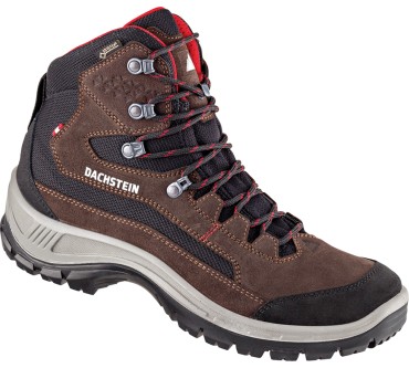 Der Schober MC GTX von Dachstein ist ein robuster Wanderschuh mit knöchelhohem Schaft und griffiger Sohle. Der Schaft besteht zum Teil aus strapazierfähigem sowie langlebigem Veloursleder und zum Teil aus atmungsaktivem Meshgewebe. Durch eine Membran aus Gore-Tex weist er Wasser ab, sodass gelegentliche Regengüsse nicht zu nassen Füßen führen. Als Verschluss dient ein Schnürsystem. Damit lässt sich der Schaft gut an die individuelle Fußform und die Dicke der getragenen Socken anpassen. Im Gelenkbereich wird der Schnürsenkel durch Metallösen geführt. Dadurch wird das Schnüren zum einen leichter und zum anderen ist die Haltbarkeit höher. Die Sohle ist mit einem selbstreinigenden Profil versehen. Eine Zwischensohle dämpft den Tritt und schont somit die Gelenke.