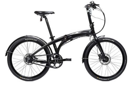 Die Weltneuheit am Dahon IOS XL ist der Lithium-Polymer-Akku BioLogic FreeCharge, der vom Nabendynamo gespeist wird und über einen USB-Anschluss Handy, iPod, GPS und Co auflädt. So schont der urbane Pendler die Umwelt. Obwohl das IOS XL ein wenig größer als Dahons bisherige Falträder ausfallen wird, lässt es sich beinahe auf die Größe seiner 20-Zoll-Geschwister falten. Dies dauert angeblich nur Sekunden. Sein Vorbau ist einfach und stufenlos verstellbar und kann so der jeweiligen Stimmung des Fahrers angepasst werden: möglich ist die sportliche Schnellfahrerposition oder eine gemütliche, aufrechte Haltung. Womit wir bei der Beleuchtung angekommen wären. Die zweitletzte augenfällige Systemintegration des IOS XL ist die Frontbeleuchtung. Das Valo-Licht ist völlig in den Vorbau integriert und sorgt dort auf Lenkerhöhe für die optimale Lichtausbeute. Die LED-Leuchte wird ebenfalls aus dem Nabendynamo gespeist. Abgerundet werden die Highlights mit einer in der Sattelstütze integrierten Standpumpe, deren Anschlussschlauch mit einem Handgriff am Ventil befestigt ist. Der Sattel ist der Griff und die Stütze selber der Pumpkolben. Damit hat der urbane Pendler tatsächlich alles, um mit einem Fahrrad glücklich zu werden.