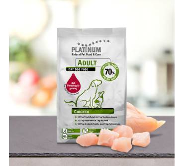 Platinum Adult Chicken ist ein Trockenfutter mit Geflügel für erwachsene Hunde. Das getreidefreie Alleinfuttermittel ohne künstliche Inhaltsstoffe dürfte das Interesse all derjenigen auf sich ziehen, die ein Hundetrockenfutter mit einem überproportional hohen Frischfleischanteil zur Alleinfütterung suchen.