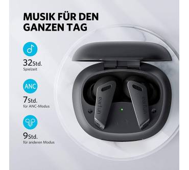 Im handlichen Ladecase sitzt ein Akku, der genug Saft für drei Komplettladungen hat. Leider fehlt eine Anzeige, mit der Sie den Ladestand der eingesetzten Kopfhörer kontrollieren könnten. Laut „funkkopfhoerer-infos.de“ dauert es zwei Stunden, bis die Mini-Akkus (jeweils 60 mAh) geladen sind, anschließend können Sie bei moderatem Pegel rund 7,5 Stunden Musik hören – mit aktiver Geräuschunterdrückung. Eben jene hält das Niveau der Preisklasse, reduziert den Lärm also nur mäßig. Ein störendes ANC-Grundrauschen bleibt dafür aus. Weiterhin positiv: Das Design ist gelungen, die automatische Pause/Wiedergabe-Funktion praktisch. Abzüge gibt es, weil die Touch-Steuerung beim dreimaligen Tippen unzuverlässig reagiert. „Sehr gut“ findet man den Klang, der als klar, sauber, ausgewogen und bassstark beschrieben wird.