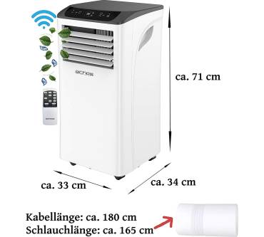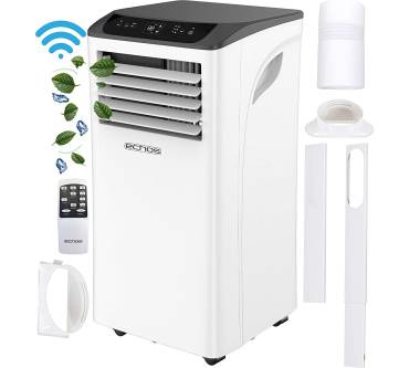 Das Klimagerät von Echos sorgt während der heißen Jahreszeit in kleineren Räumen für eine erfrischende Brise. Das Standgerät bietet Ihnen zwei Geschwindigkeitsstufen und einen Schlafmodus. Es ist zudem mit einer Timer-Funktion ausgestattet, deren großzügiges Zeitfenster 24 Stunden umfasst. Die Lärmbelastung ist auf der höchsten Leistungsstufe mit 65 Dezibel für den unmittelbaren Wohn- und Schlafbereich hoch. Neben dem Kühlen beherrscht das Echos auch die Entfeuchtung der Raumluft, die Entfeuchtungsleistung fällt mit 24 Liter pro Tag großzügig aus. Steuern können Sie das mit Laufrollen ausgestattete Standgerät wahlweise über ein gut erreichbares Touch-Bedienfeld, die im Lieferumfang enthaltene Fernbedienung oder via App über Ihr Smartphone. Mit im Lieferumfang dabei ist ein Montage-Set für den Abluftschlauch.